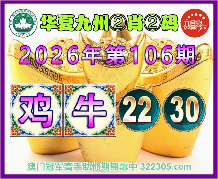 106期:【华夏九州】 🎖️②肖②码🎖️【鸡牛】【22.30】开:鸡22准